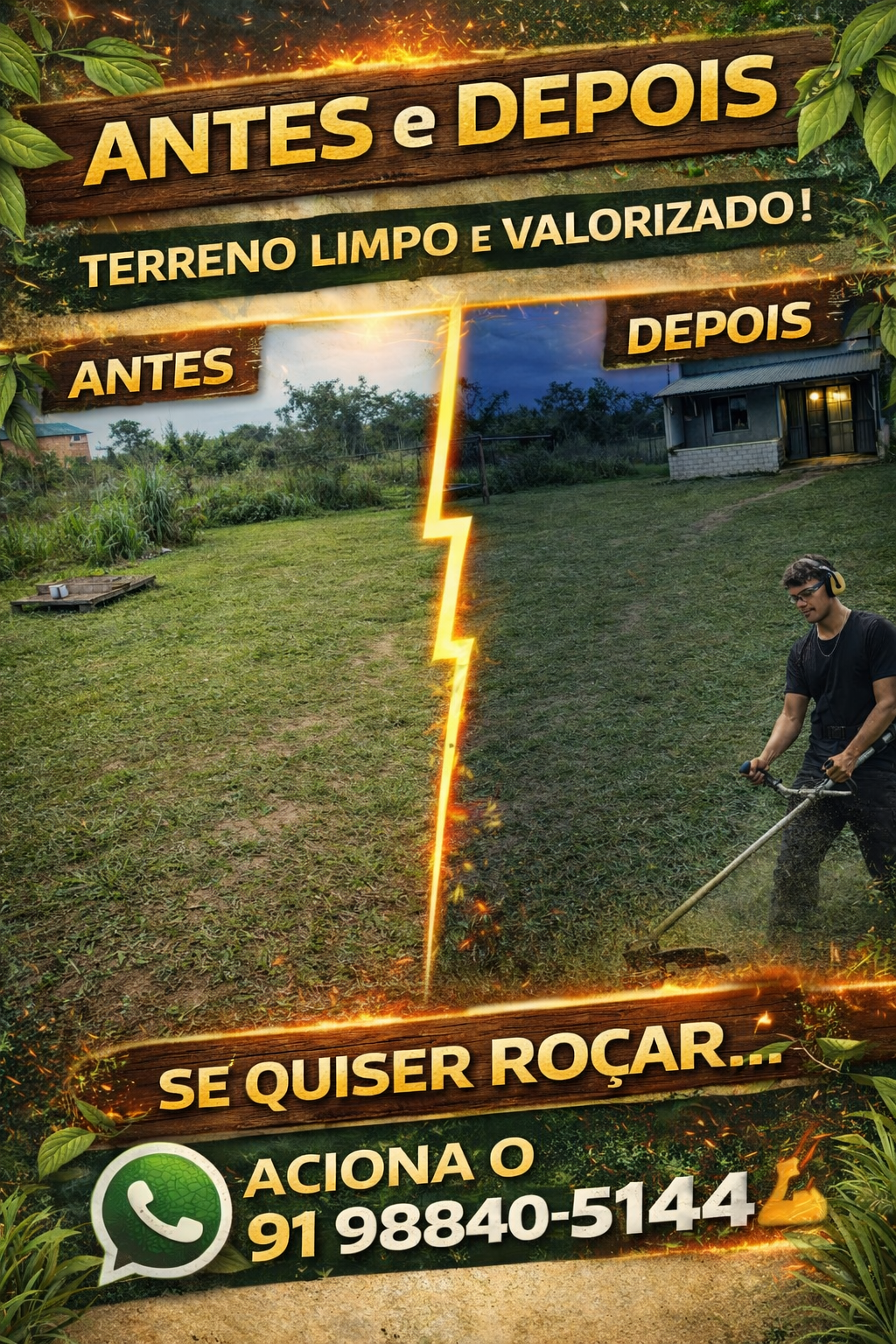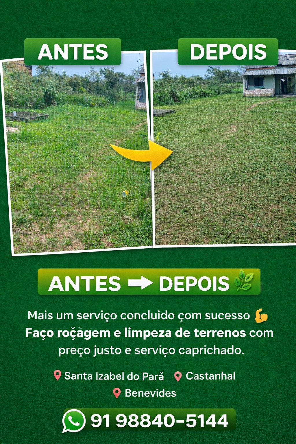 🌿 TERRENO LIMPO, VALORIZADO E SEGURO! 🚜✨ Cansado do mato alto e do perigo de bichos peçonhentos? Eu resolvo com agilidade e perfeição! ✅ O que eu ofereço: Roçagem profissional e limpeza detalhada. Acabamento impecável (cantos e beiradas). Prevenção contra focos de doenças e pragas. 💳 Facilidade: Aceito Pix e Cartão (parcelo se precisar). 📍 Região: Santa Izabel, Castanhal e Benevides. 📢 NÃO DEIXE O MATO TOMAR CONTA! Mande uma foto agora e receba seu orçamento sem compromisso. 👇 Chame no WhatsApp: 📲 (91) 98840-5144