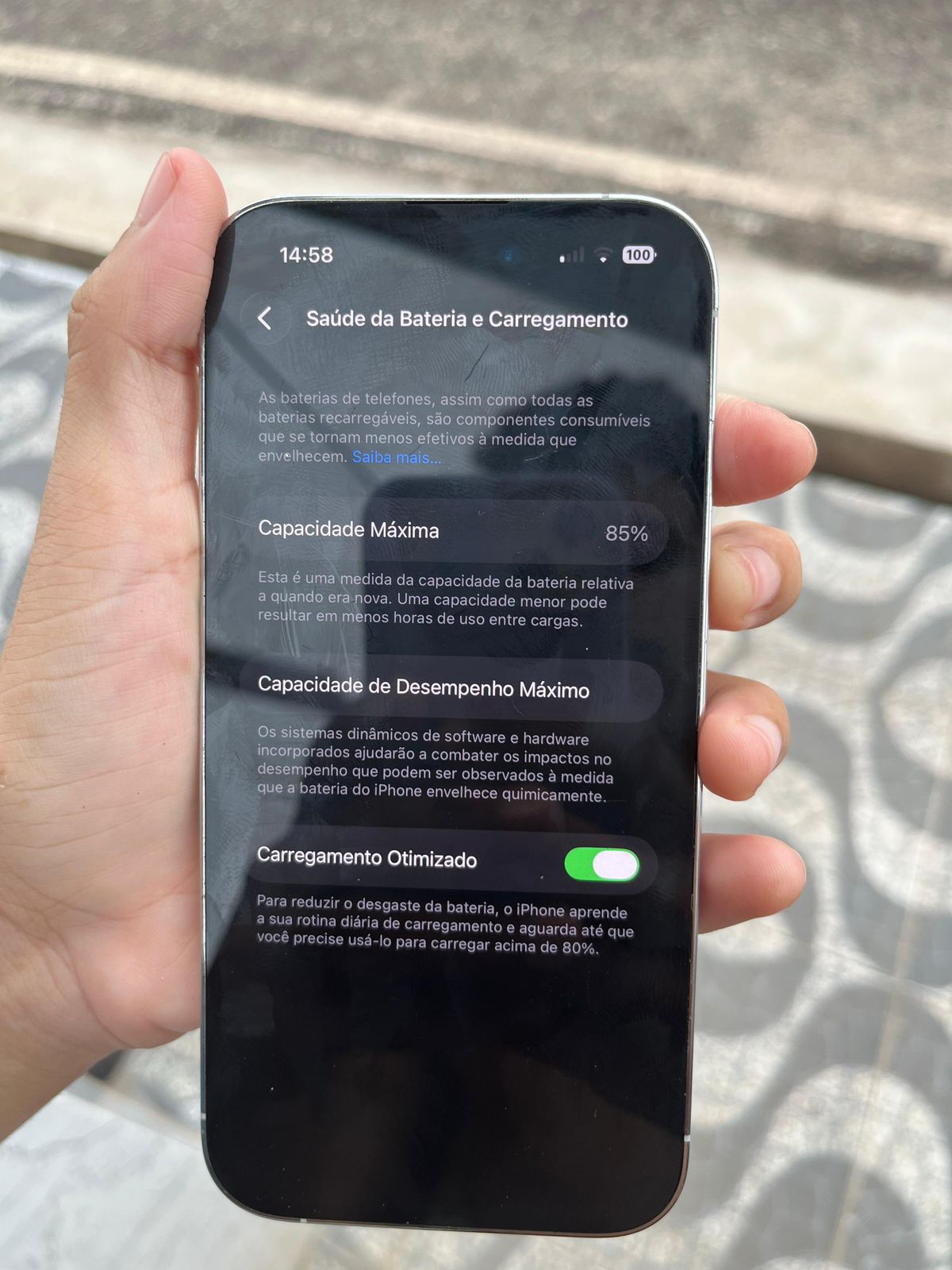 Vendo iPhone 14 Pro 128GB Aparelho muito bem cuidado, sempre usado com capa e película. 🔋 Saúde da bateria: 85% 📦 128GB de armazenamento 📱 Face ID funcionando perfeitamente 📸 Câmeras impecáveis (modo cinema, 48MP) ✨ Sem detalhes aparentes / bem conservado Celular está funcionando 100%, sem vícios ou defeitos. 💰 Valor: R$ 3.300 ou 3.250 avista (negociável para venda rápida)